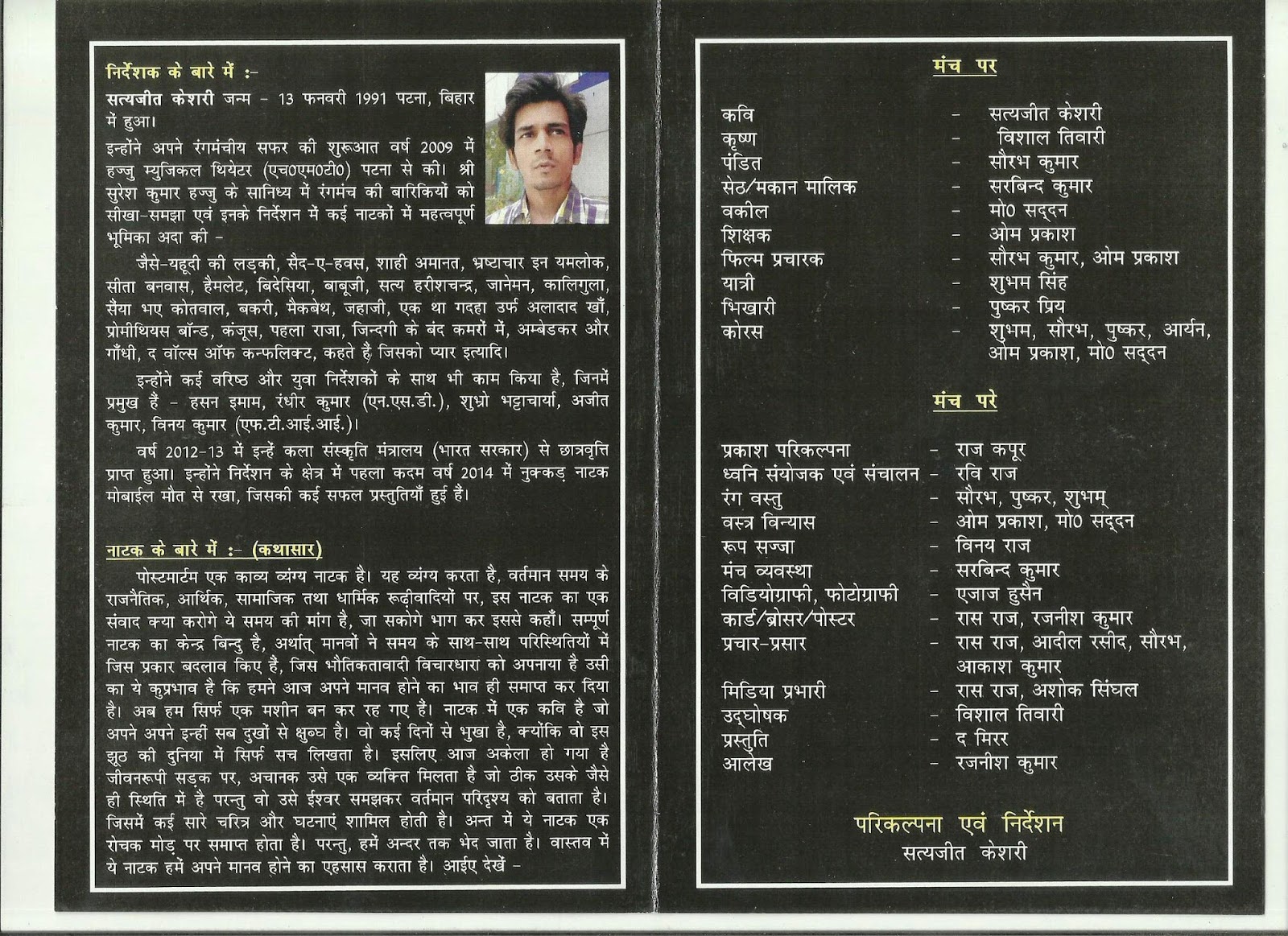 ‘Postmortem’ was staged at Kalidas Rangalay, Patna on 16.6.2016 by the group christened as ‘The Mirror’. It was written by Rajnish Kumar and directed by debut director Satyajit Keshri. The show was a huge success in terms of acting and direction. The story is like a commentary on burning issues of nowadays. Undoubtedly, the whole narrative packed by message was stout throughout the show and necessary care was taken to keep the audience entertained by a couple of rammed dance sequences which actually worked. The concept of the character God seems to have been borrowed from the film OMG. The scene of a plump man walking with his pet dog and symbolizing the typically compromised person of today enthralled everyone in the hall. His hot debate with the Poet who is the main character of the play was thought-provoking. Light & Sound , Stage concept and backstage support were fine. A thread of fable might have added much value to the play but suggesting the same would amount to challenging the whole schema of the play. The actors acted in a natural flow notwithstanding the character they played. Each of the actors showed his mettle playing the characters given may it be of the Poet, God, Plump man or the most magical character of Dog. The Dog really behaved like a dog as expressed by his body-language and actual barking sounds. The whole team has every reason to cheers.